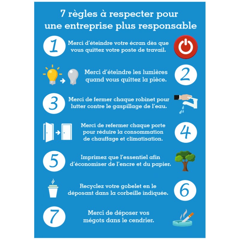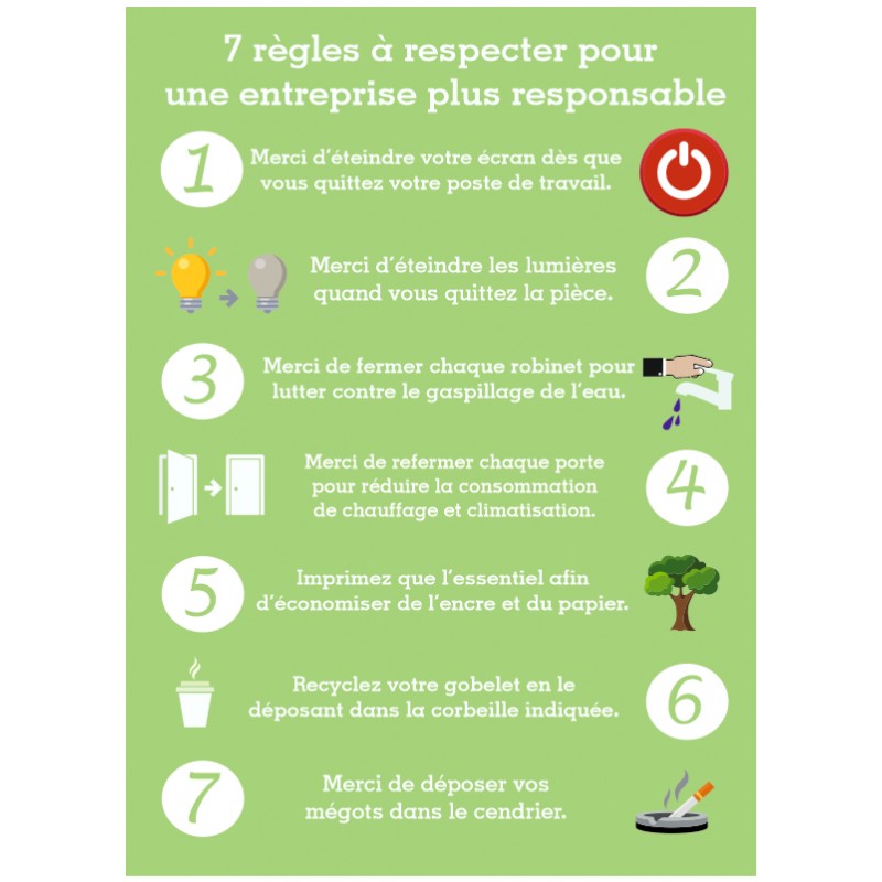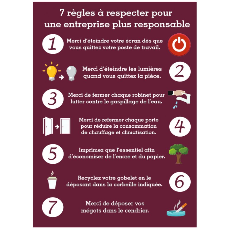 Sticker 7 règles à respecter pour une entreprise plus responsable. Sensibilisez vos équipes pour générer moins de déchets et utiliser moins de ressources pour une entreprise plus responsable.